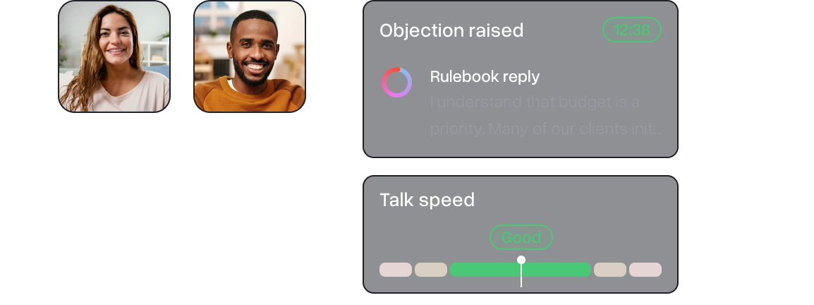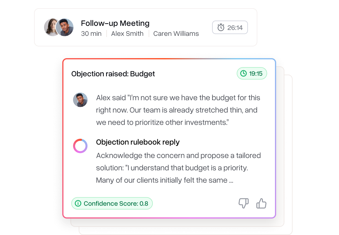 Live guidance during high-stakes sales calls, including objection handling, discovery prompts, and response suggestions.