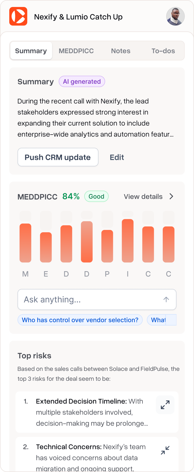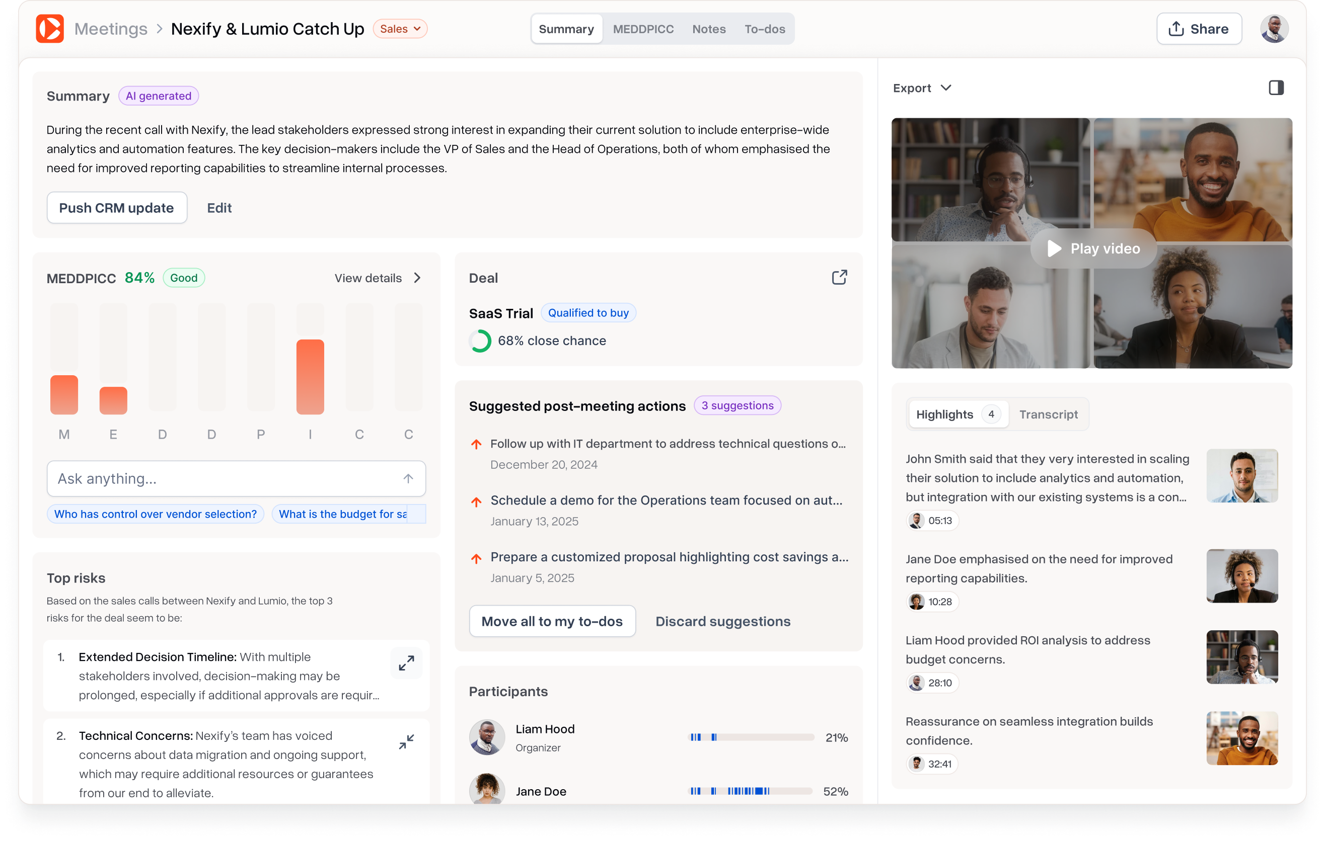 With deep HubSpot and Salesforce integrations, we dynamically sync the CRM after every meeting ensuring data hygiene is 100%.